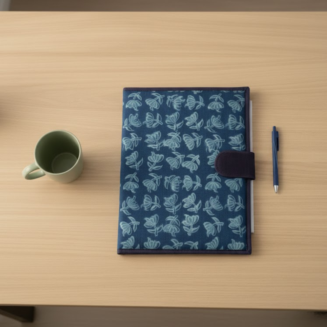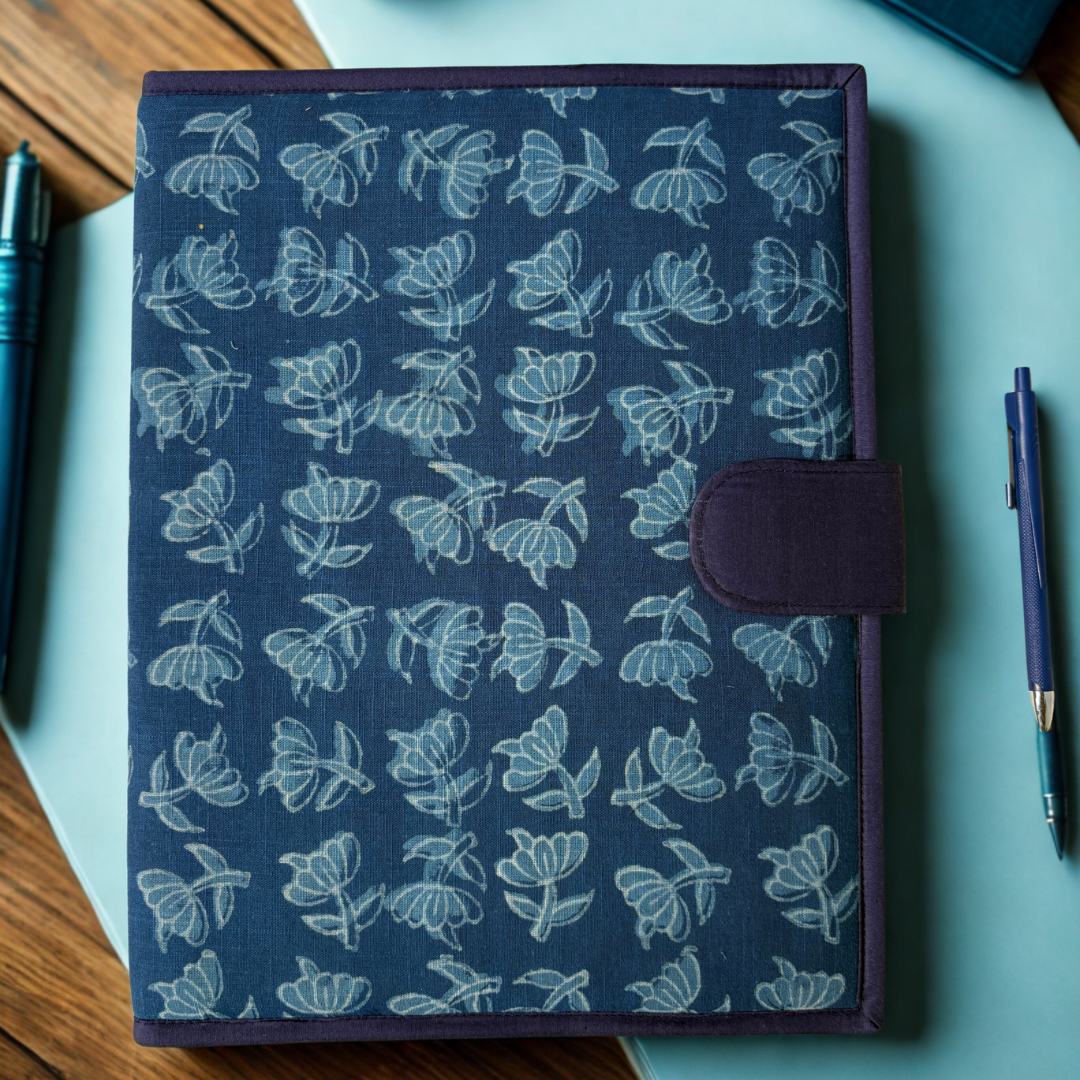 Print - Handblock PrintColour - Indigo Description - Stay stylish and organized with this handcrafted file folder, designed using traditional indigo-dyed cotton fabric. Perfect for office meetings,...