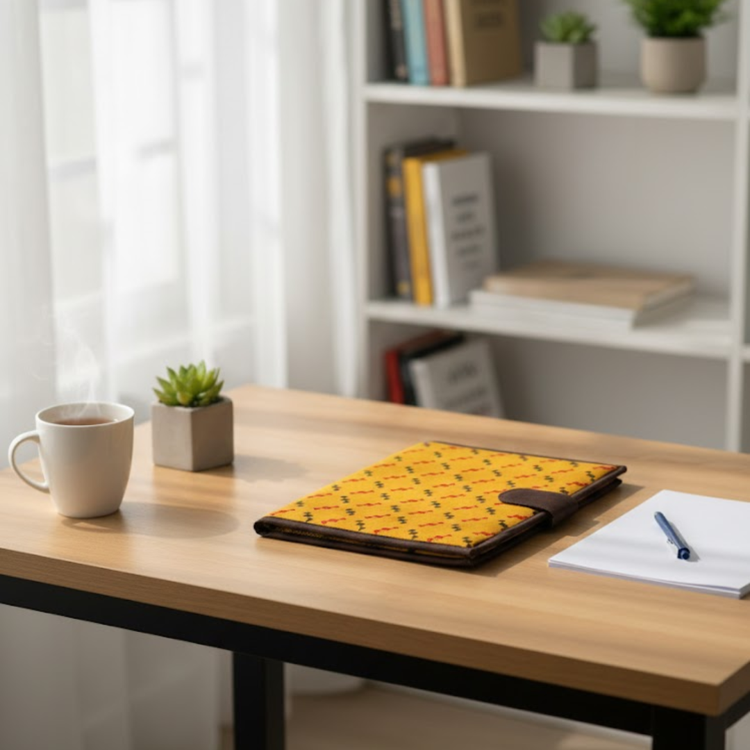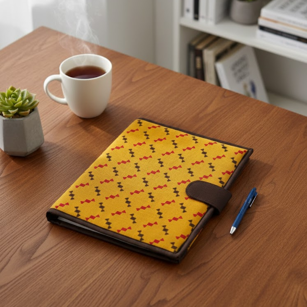 Print- Geometric PatternColour -YellowDescription - Stay stylish and organized with this handcrafted file folder, designed using cotton fabric. Perfect for office meetings, travel, or daily use car...