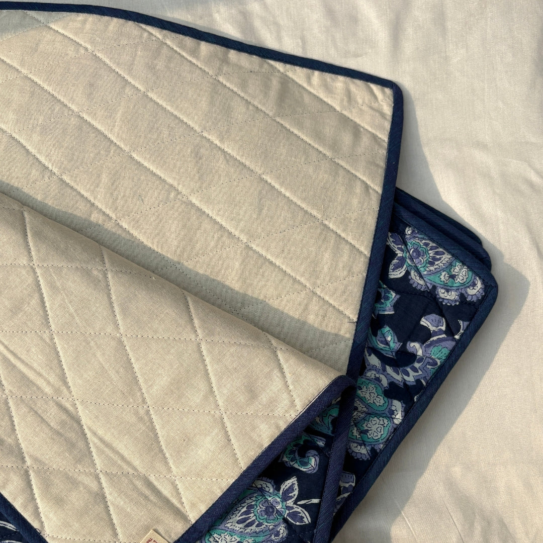 Quilted Table Mats + One Runner Set in a beautiful navy blue paisley print.