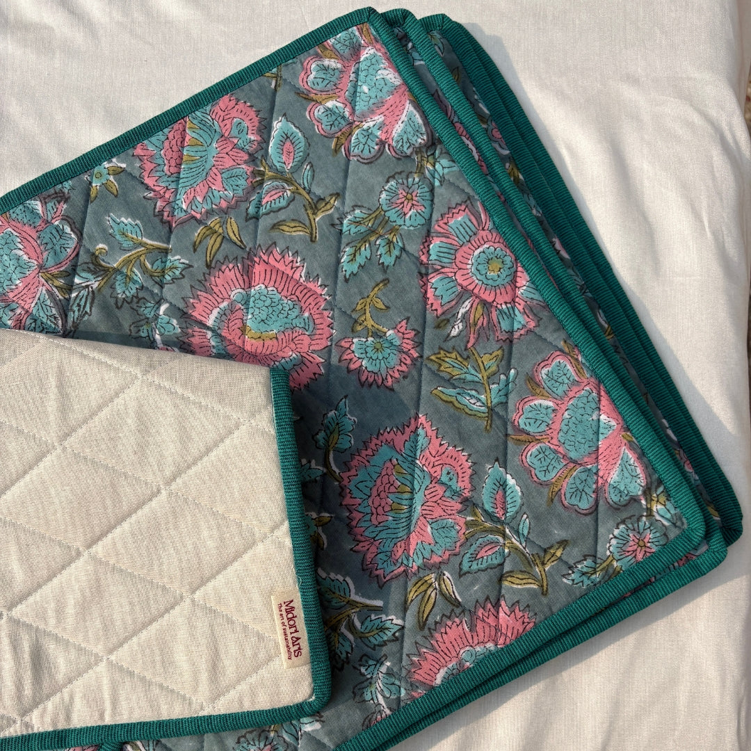 Quilted Table Mats + One Runner Set in a beautiful gray base with floral print.